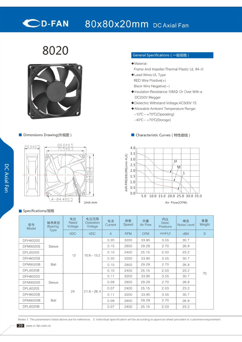 材料: 框架和叶轮:热塑UL 94-0 引线.UL类型 红色导线正极(+) 黑线负极(-) 绝缘电阻:10MΩ或以上,带DC250V高阻表 介电耐压:AC500V 1S 允许环境温度范围: -10℃-+70℃(运行) -40℃-+70℃(储存)