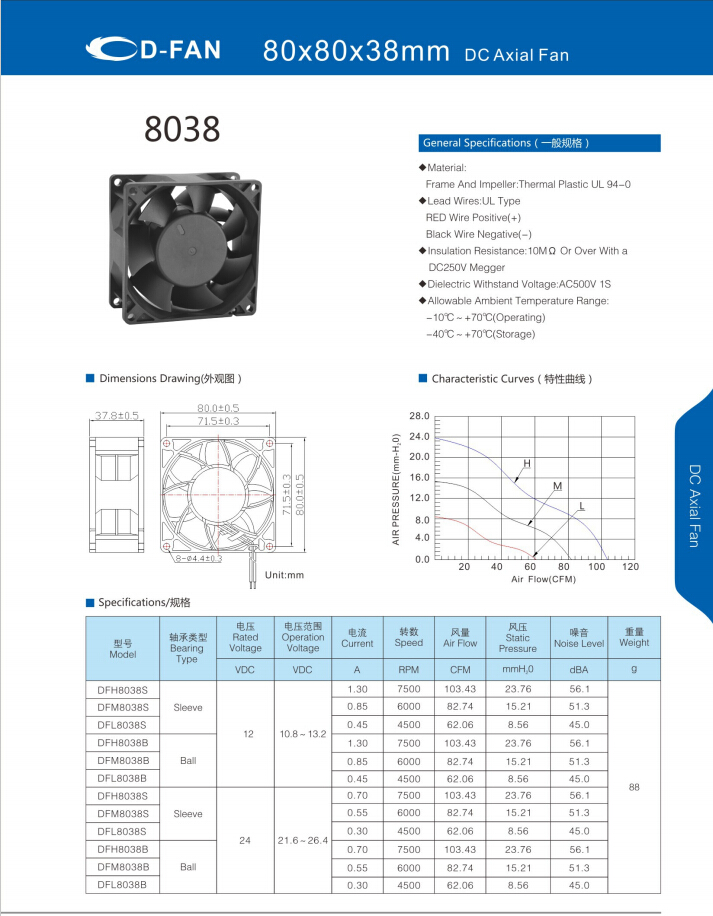 材料: 框架和叶轮:热塑UL 94-0 引线.UL类型 红色导线正极(+) 黑线负极(-) 绝缘电阻:10MΩ或以上,带DC250V高阻表 介电耐压:AC500V 1S 允许环境温度范围: -10℃-+70℃(运行) -40℃-+70℃(储存)