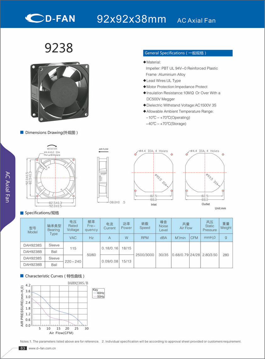 材料: 叶轮:PBT UL 94V-0增强塑料框架铝合金 导线:UL型 电机保护:阻抗保护 绝缘电阻:1欧姆或以上,带DC500V高阻表 介电耐压:AC1500V 3S 允许环境温度范围: -10℃-+70℃(运行) -40℃-+70℃(储存)